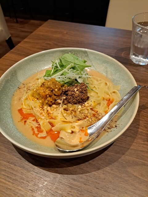 初めにハーフ麻婆豆腐「黒」が入りました。辛すぎないところですが、確かに辛かったですが、この辛さは好きですね。豆腐がしっかりしていて「やっぱり一流な麻婆豆腐だ」と納得してしまいます。柳橋焼き餃子は「花楼」の名古屋柳橋本店伝来であります。そのままでも、塩をつけても美味しくいただけました。8個あって十分な量です。名物の汁なし担々麺、辛さ普通ならばちょうど良くて平打ち麺もいい味わい出してくれます。丁寧な、上品な担々麺です。