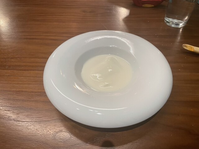 5皿目は、とうもろこしの冷製スープ。真ん中に浮かんだ鹿の煮凝りを溶かしながら、シャキシャキのとうもろこしの実もかなり入っていて、甘〜い!私が3口ぐらいゆっくり味わっているうちに、連れが完飲!お皿を舐め始めるのではないかと心配するぐらいの超スピードに、店員さんも微笑む。