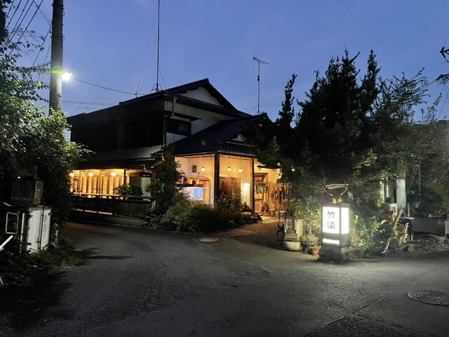 浜松での仕事のおり、無理を言って予約をしてもらった。浜松から遠州鉄道に乗り35分、終点で天竜浜中湖線に乗り換え、一駅、そこから住宅街を歩いて10分と、かなりアクセスは悪い…。しかし、これから出会えるであろう最高のジビエとの出会いへの期待で全然苦にならない。かなりの交通量の道を渡ると、その奥に竹染さんはあった!