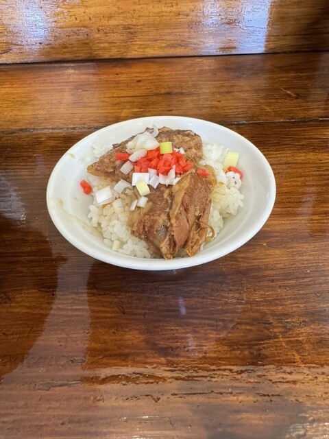 暑さに負けずデフォの熱い特製煮干しらーめんと肉飯をチョイス(''∇^d)