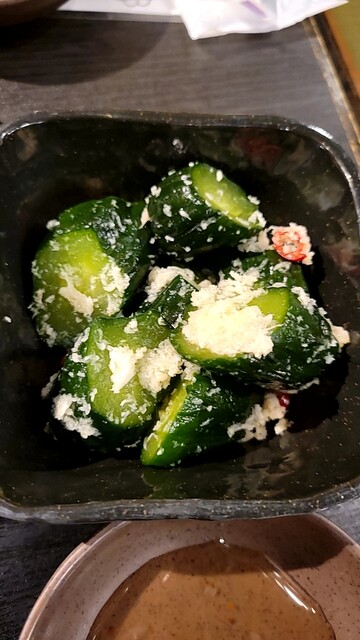 山わさびきゅうり。多分もともとは山わさびと一緒に漬け込まれているんでしょうね。提供時につけ汁を絞って盛られている感じ。山わさびは別盛でまぶされている方が絶対いいと思う。辛み成分すっかりなくなっています。