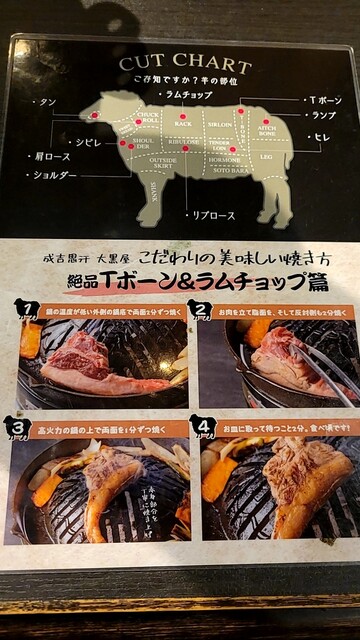 ラムチョップ。しっかり美味しい焼き方がシートで案内。