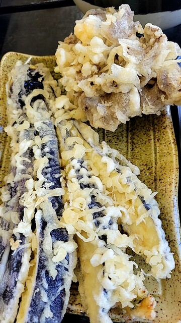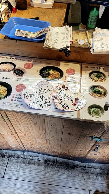 ・油うどんひや 600円 ・ごぼう天 250円 ・ちくわ天 130円 ・白まいたけ天 300円 ・きくらげ天 180円