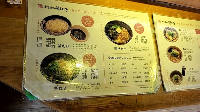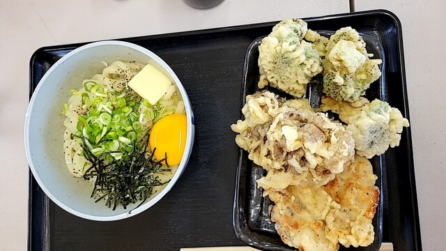 ・釜バター(1玉) 620円 ・かしわ天 180円 ・まいたけ天 220円 ・ブロッコリー天 220円