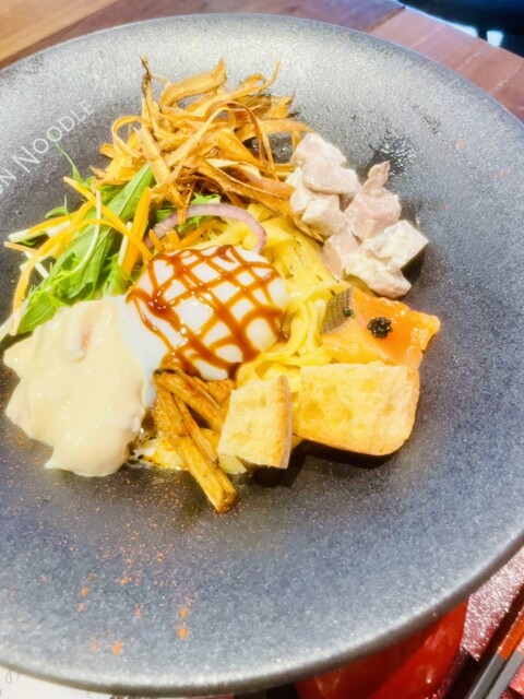 次にいただいたのは「サーモンまぜそば」丼の中には、特製の醤油ダレと絡んだ太麺、角切りのサーモン、海苔、ネギ、卵黄が美しく盛り付けられています。