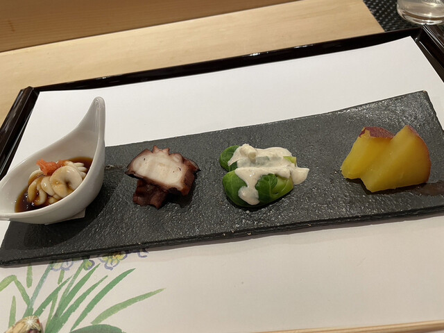 白子、たこの柔らか煮、芽キャベツのアンチョビクリームチーズソースかけ、さつまいもの甘煮