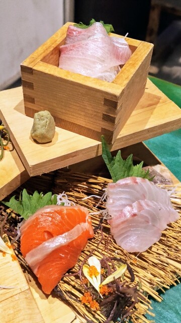 漁場ウ合・名物!!!漁師町の刺身階段盛りが5種の盛り合わせで500円とお得でした。