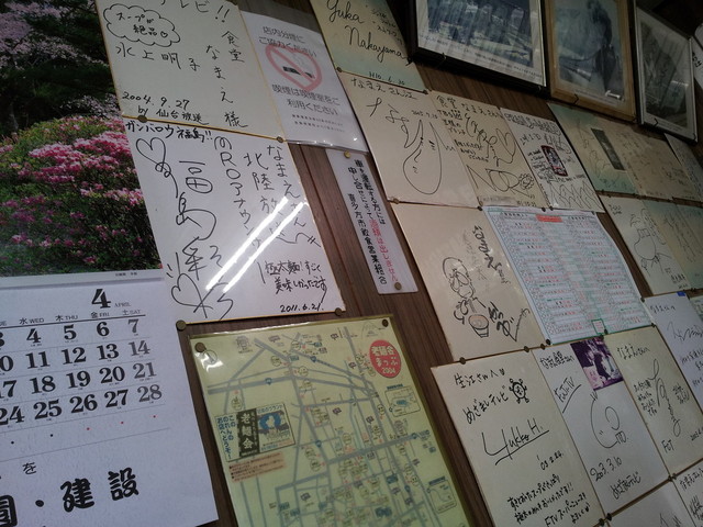 土曜の開店時刻10時よりも少し早い9時50分に2名で訪問した。すでに暖簾がかかっているので思い切って入店、「もう少し待った方がいいですか。」と聞くと、笑顔で「どうぞ。」と答えてくれた。店内の壁には色紙がたくさん飾られていて、2003年あたりのサインが多い。
