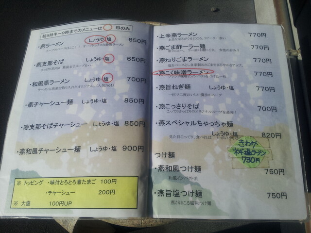 燕ラーメン塩650円、燕支那そば塩650円を注文した。