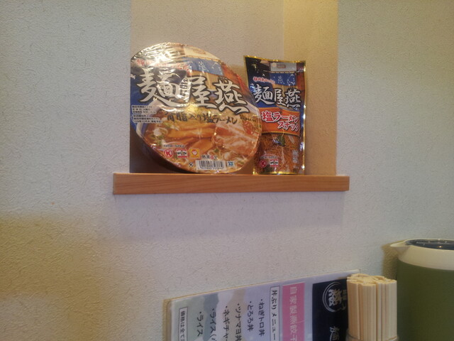 カウンター席の壁に麺屋燕のカップ麺が飾られている。サークルKサンクスでの限定販売なのかな。マルちゃんからカップ麺を出しているみたい。
