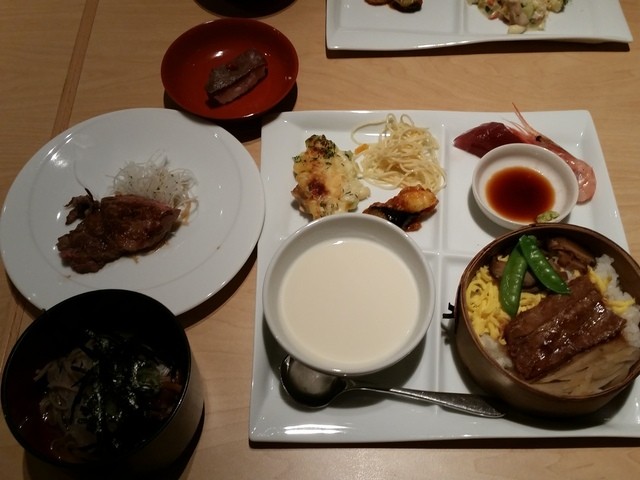 夕食は、Kisse-Kisseビュッフェというもの。季節の創作料理をはじめとして前菜から主菜、スープ、会津郷土料理、そしてデザートなどの料理が約50種類用意されている。料理はどれもおいしかった。刺身がイマイチなのは内陸だから仕方ないだろう。