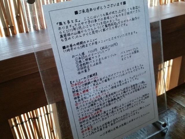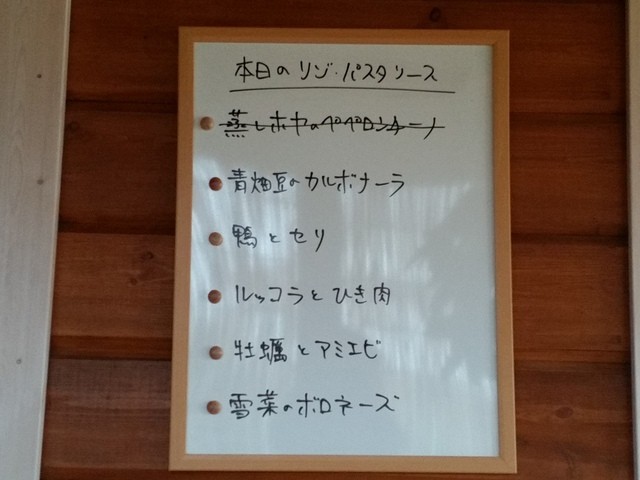 日曜の昼に2名で訪問した。県道10号線から小道に入った先にある。あらかじめお店の場所を調べておかないとたどり着かないかも。入店すると客入りは6割ほど。外観も内観もログハウス風の造りでおしゃれだ。ランチ1100円を注文した。内容は以下の通り。パスタ麺は3種類から選べ、パスタやリゾットのソースは5種類の中から選ぶことができるため、バリエーションが豊かなんだな。