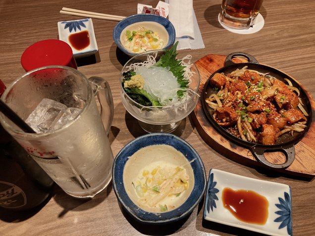 岩手県産蒸し牡蠣 鯵刺身 ホルモン炒め メガ酎ハイ