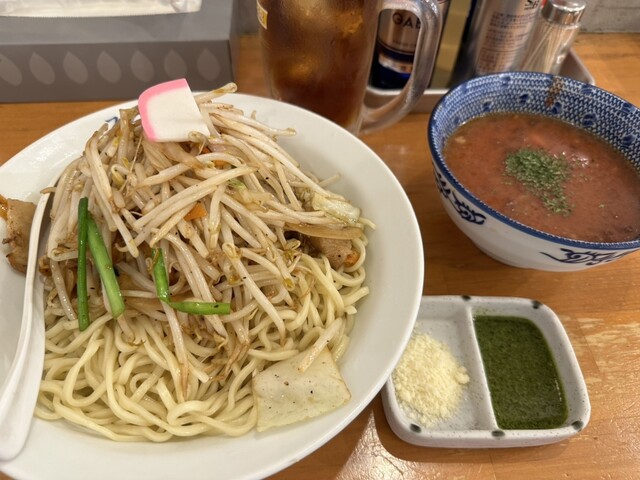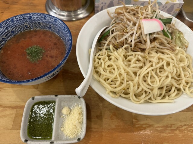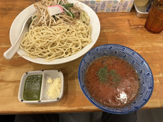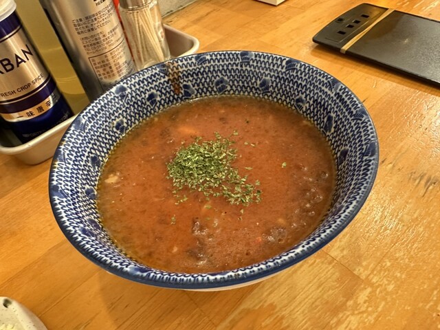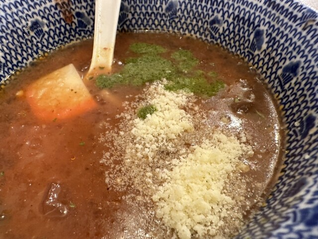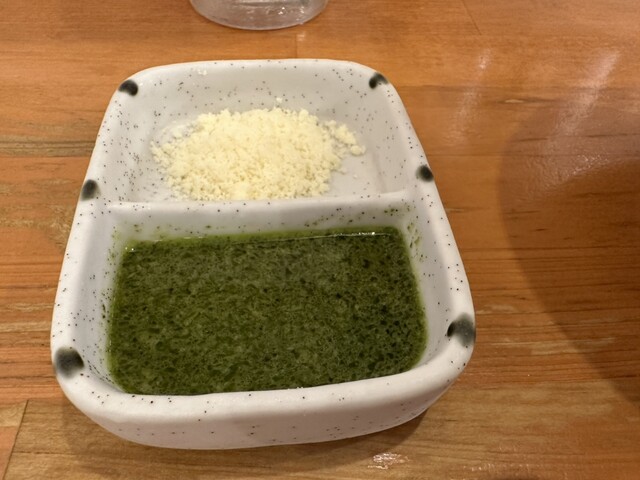 ●最初は、麺をスープに付けてそのまま食べてお店の味を楽しみ、少し食べたらスープにバジルと粉チーズをトッピングして食べて別の味を楽しみました。