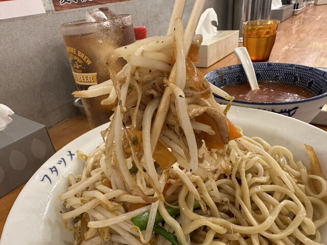●冷やしトマトもりたんめんの麺は、冷たいどんぶりの中に冷たい麺と熱い野菜炒めがたっぷり盛り付けてありました。