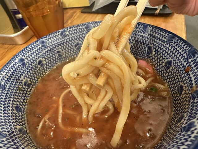 ②麺の太さ:中太平打ち麺