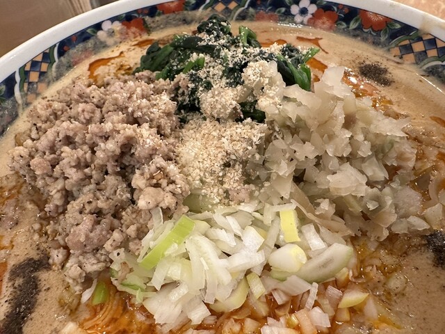 ●極農四川担々麺は、麺の上に挽肉、ほうれん草、刻み玉ねぎ、刻みネギ、ゴマ等が盛り付けてありました。