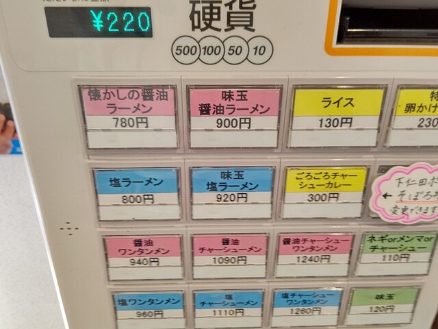 ●今回は、券売機の一番右上にあるメニュー【醤油チャーシューワンタンメン1,150円】の食券を購入し、ラーパスを提示して大盛を注文しました。