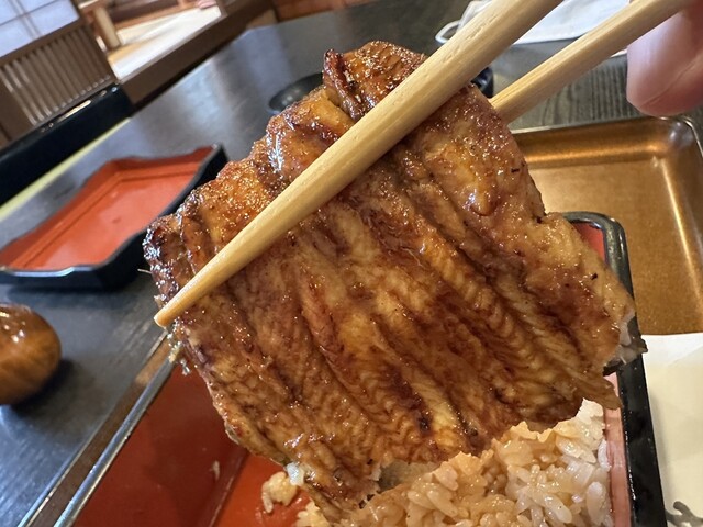 ●うな重は、ご飯の上に甘さが控えめなタレと鰻の蒲焼がたっぷり盛り付けてありました。