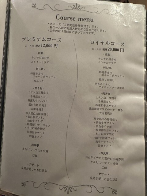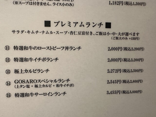 ●今回は、女性店員に確認したお勧めの「⑭GOSAROスペシャルランチ(上タン塩+極上カルビ+和牛イチボ+並盛飯+スープ+野菜サラダ+漬物+杏仁豆腐)2,800円」を注文して写真撮影の許可を頂きましました。