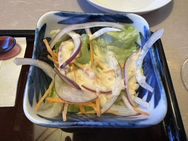 ●野菜サラダは、レタス、玉ねぎ、大根な等が盛り付けてあり、ドレッシングとの相性が良くて美味しかったです。