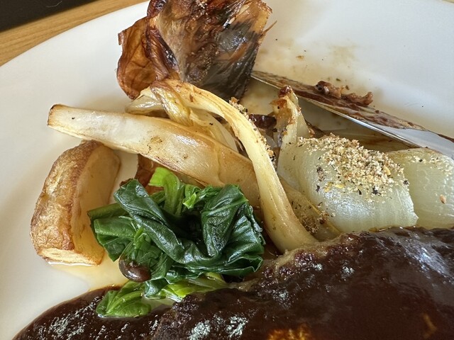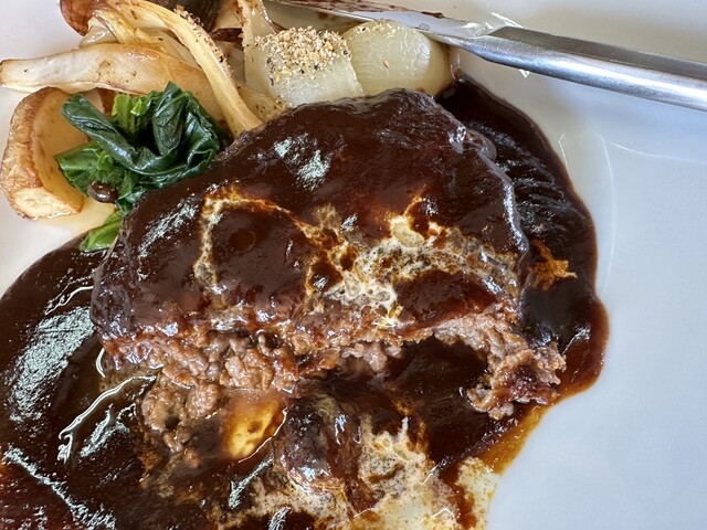 ●自家製デミグラスソースハンバーグは、お皿にハンバーグ、玉ねぎ、馬鈴薯、ほうれん草が鮮やかに盛り付けてあり、大きくて柔らかいお肉のハンバーグとデミグラスソースとの相性が良くて美味しかったです。