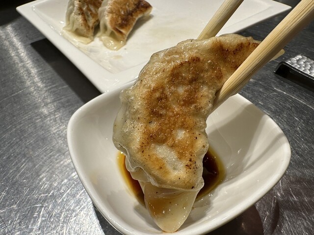 ●ギョーザは、厚めの皮の中にニラや肉を中心とした具がたっぷり入っている餃子が4個盛り付けてあり、酢とラー油と醬油を付けて食べたら美味しかったです。