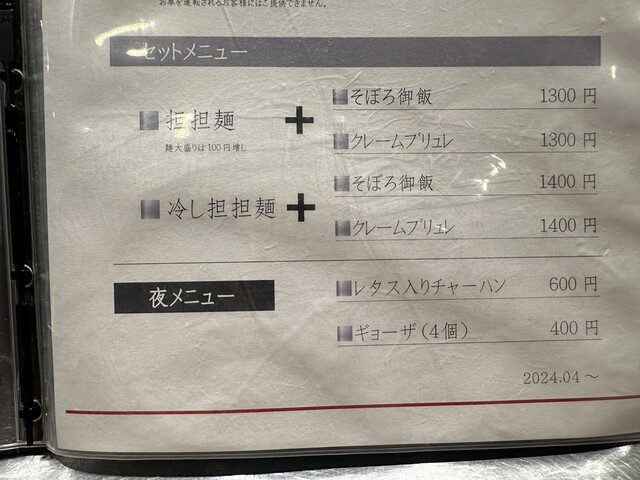 ●今回は、「冷し担担麺+そぼろ御飯(並盛・180g)1,400円」と夜メニューの「ギョーザ(4個)400円」を注文して店員に写真撮影の許可を頂きました。