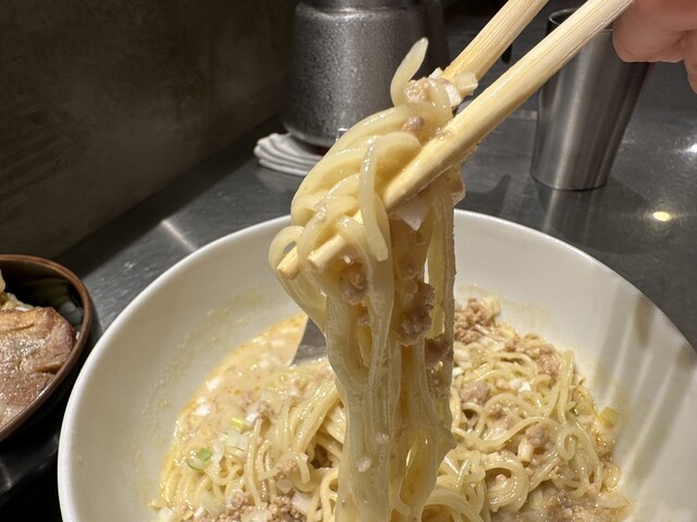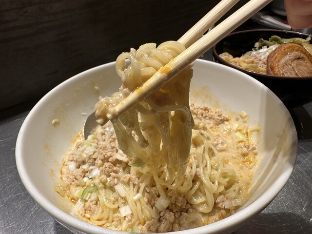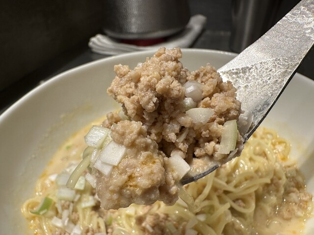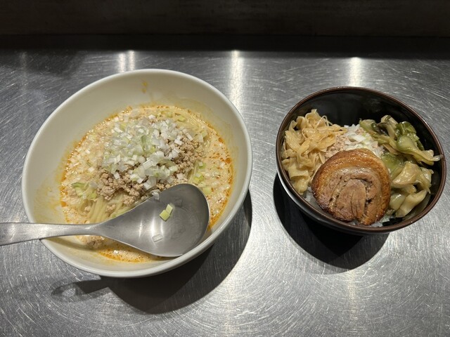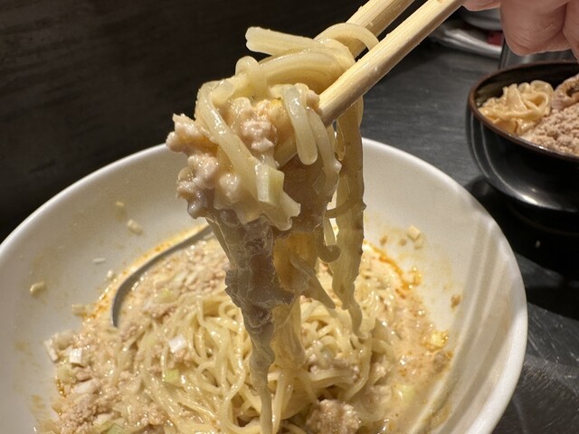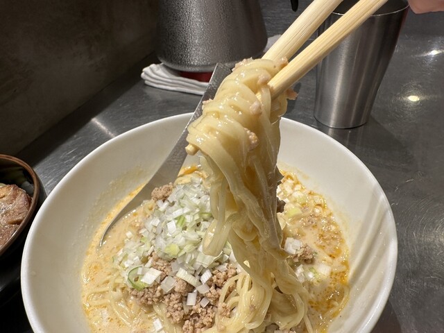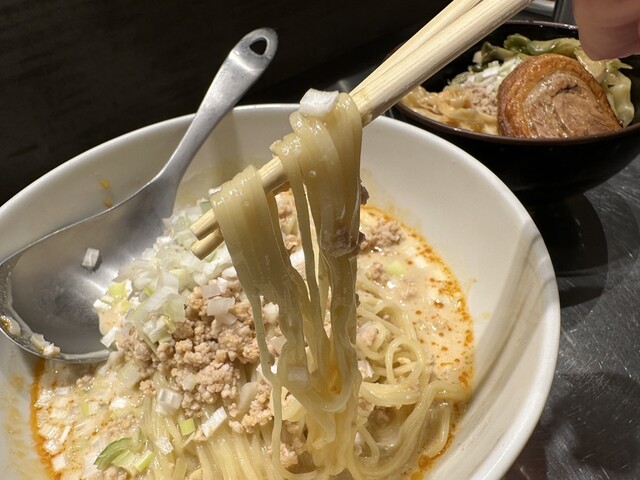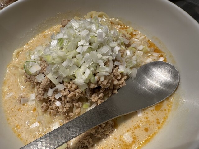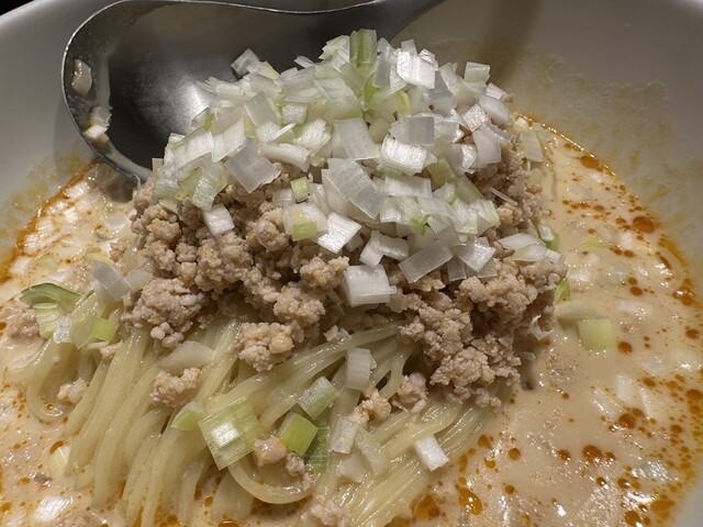 ●担担麺には、挽き肉、刻み玉ねぎがトッピングされていました。クリーミーで山椒のピリ辛が少し感じられるスープと柔らかめの細麺で非常に美味しかったです。