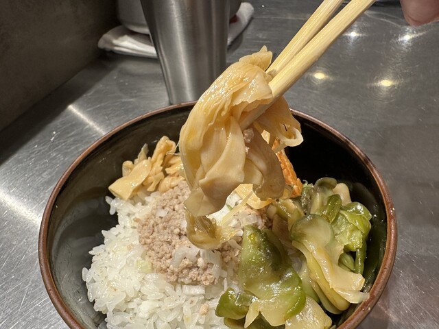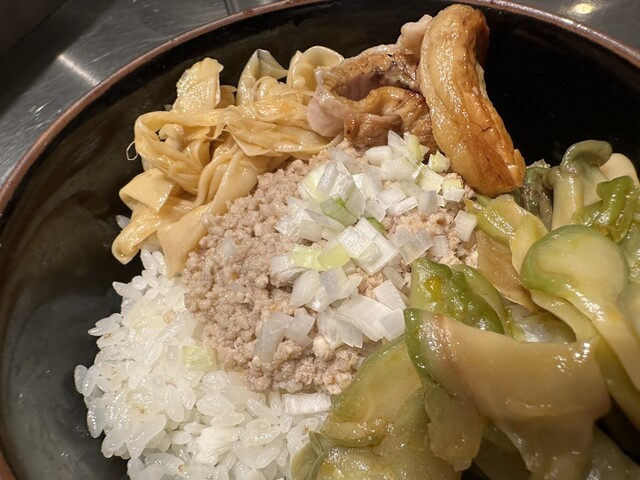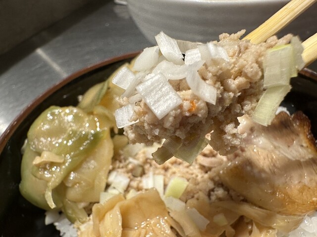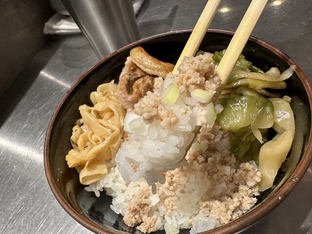 ●そぼろご飯は、炙りチャーシュー、そぼろ、漬物、ザーサイ、刻みネギがトッピングされていて美味しかったです。