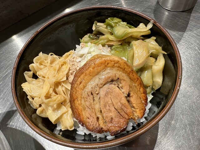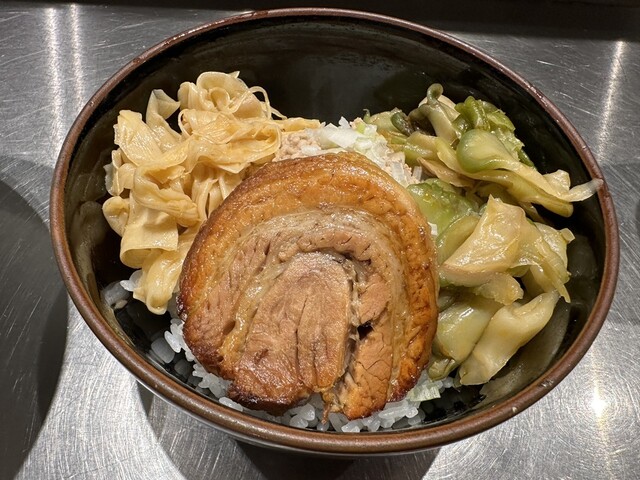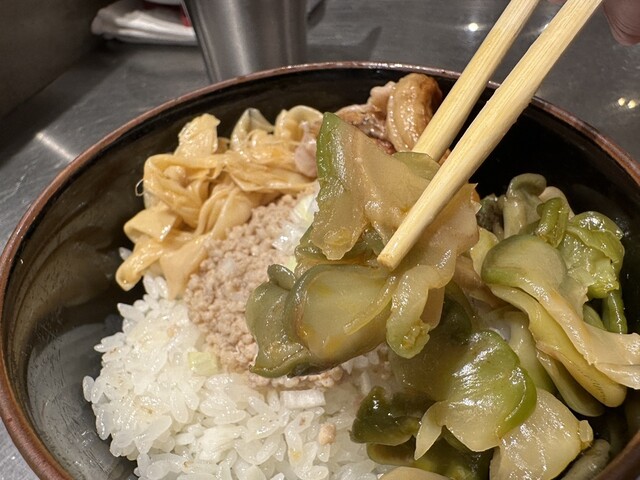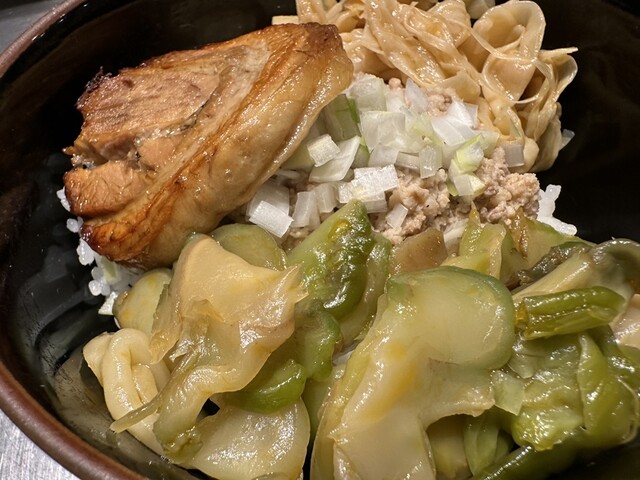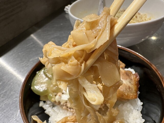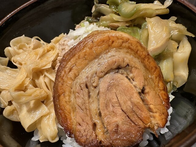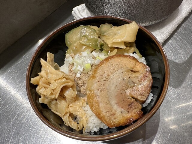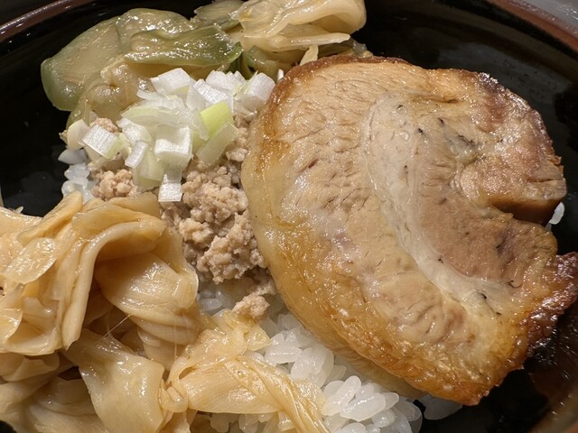 ●そぼろご飯は、ご飯の上に大きな炙りチャーシュー、細切りメンマ、ザーサイ、刻み玉ねぎがトッピングされていました。ご飯と具の相性が良くて美味しかったです。