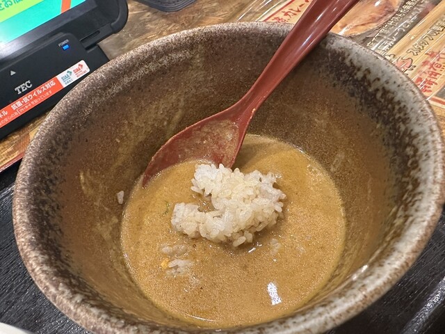 【2024.12.3(火)】豚カレーうどん(並盛・350g)のスープにご飯を入れた