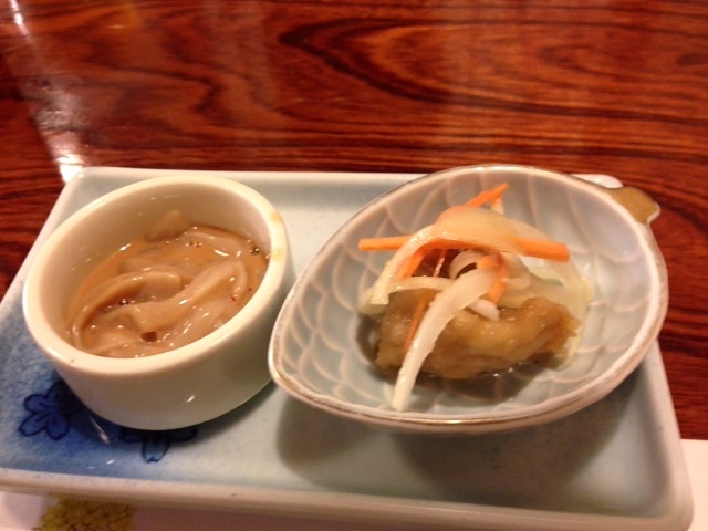 お通しは、塩辛と白身魚の南蛮酢。お酒が進みます。