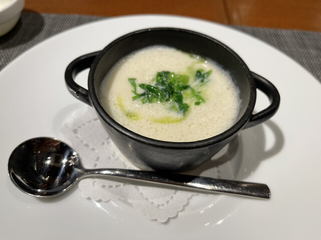 ○スープはごぼうのクリームスープ、中にはフォアグラのプリンが入っていて、とても美味。
