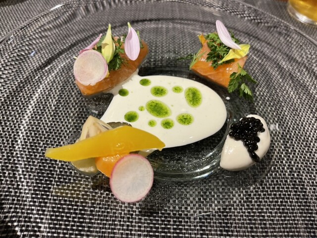 ○食前の一皿は、豆乳プリンの上にうに、ゆずを乗せ、酸味のあるソースがかかっており、食欲をそそる一品。