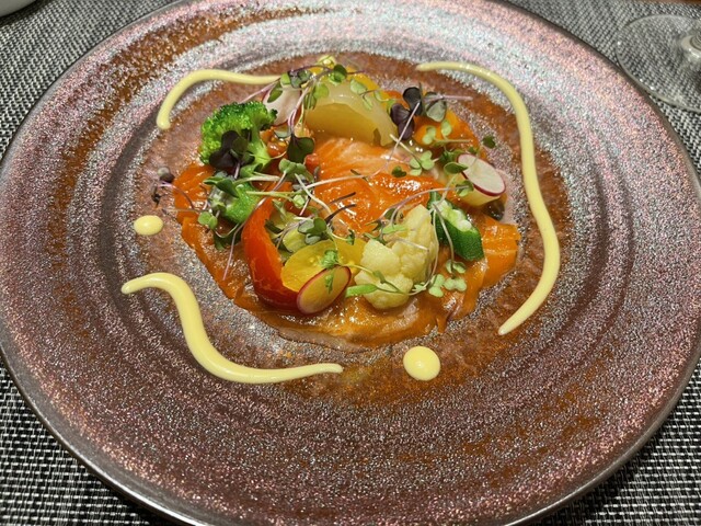 ○前菜は「ノルウェーサーモンのマリネの網焼きと冬野菜のサラダ仕立てローズマリーとハチミツの香り」