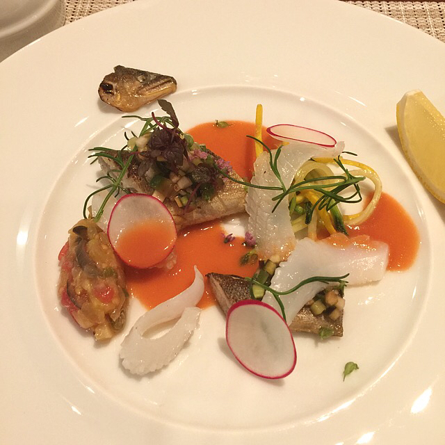 白身魚はホウボウ、淡白でなかなかおいしい。濃厚なエビのソースがぴったり。