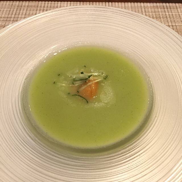 ○自家菜園でとれたキュウリの冷製スープ貝類を浮かべて