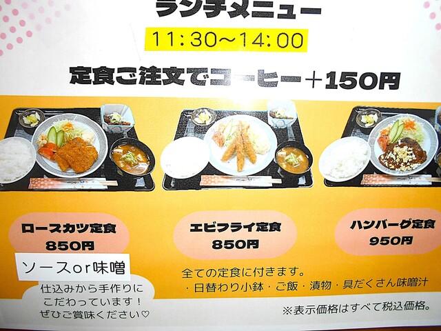 エビフライ定食(850円) ロースカツ定食(ソースか自家製甘味噌)(850円)