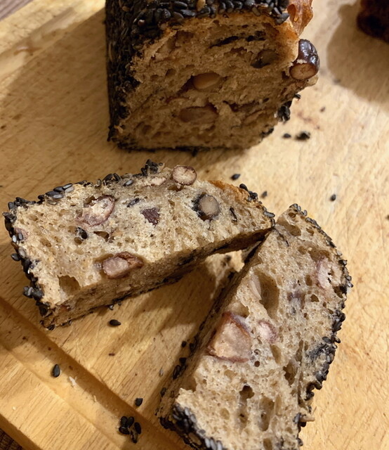 黒胡麻でコーティングされた、豆乳などを使った生地に大納言豆と黒豆がたっぷり。羊羹のイメージで食べて欲しいというパンですが、これまた美味しい・・。くちどけの良さ、品の良い甘さ。ゴマの食感と風味も良く、満足な一品でした。