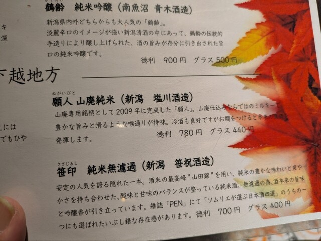 予約せずに、たまたま一人でカウンターに座れました、お店は賑わっており、人気店(さすが百名店)のようです、予約してきたほうがよいようです、まずは極辛のじゃんげ(長岡)を徳利で、ん〜好みだわ、それに合わせるように、刺身8種盛り合わせ(のど黒入り)、お一人様用の記載もあり、優しい、刺身はどれも美味しい、店員さんが丁寧に説明してくれます、次の日本酒は燗をつけると美味しいとの願人(新潟)を徳利で、さすが新潟の日本酒はどれも美味しい、ただ普段、日本酒は呑み慣れていないので調子に乗って呑むと、泥酔してしまう、気をつけなければ、お店の投稿が出来ているうちは大丈夫だが(笑)、願人がまだ、半分ほどある、魚の次は肉だな、お手軽そうな唐揚げを注文、小振りな唐揚げが食べやすく、願人を完飲、美味しい日本酒と料理、ご馳走様でした、