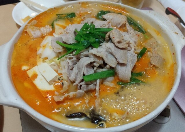 豚肉、豆腐、キムチ、キノコ類、他色々、野菜類がふんだんに入った鍋物。
