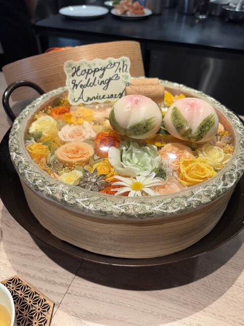 結婚記念日ランチですと事前にお伝えしていたら、素敵な蒸籠に乗った桃饅頭でお祝いしていただきました。景徳鎮の器も可愛らしかったです。