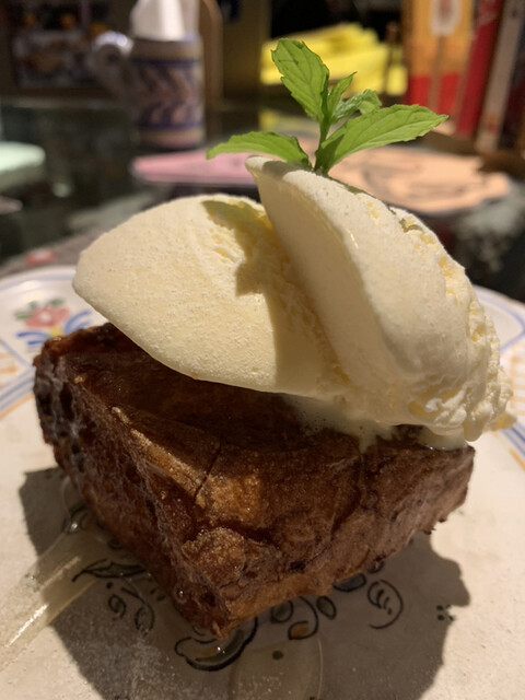 チュロスとフレンチトーストの中間なメインのケーキ?にバニラアイス乗せ。