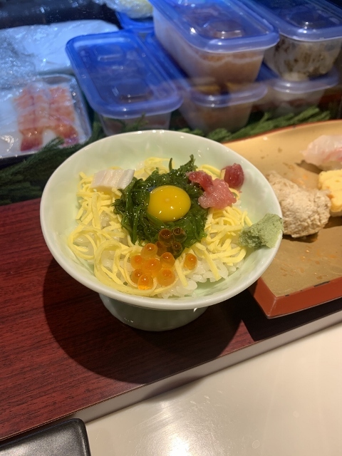 まずは海鮮、マグロ、ヒラメ、サーモン、イカ、ホタテ、しめ鯖、メカブなど