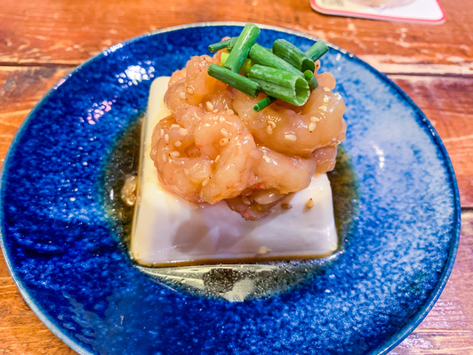 私は恥ずかしながら「カンジャンセウ」という料理を知らなかったのですが、醤油漬けという意味の韓国料理なんですね。ネットリとした食感の甘エビと冷奴の取り合わせ。美味しくいただきました。