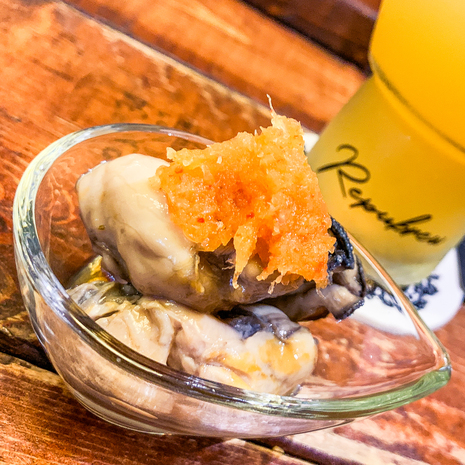 なんでも、ゴーヤは店長さんの親戚(だったかな?)の畑で取れた無農薬野菜とのこと。ゴーヤの苦味とビールの苦味が合うんですよね! 私はマヨを付けずに、ビールと一緒に "口内調味" していただきました。