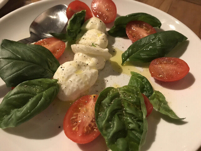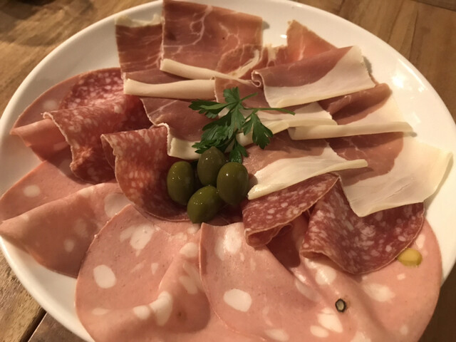 前菜・苦み菜サラダ・ハム盛り合わせ・フライドポテト・ブロッコリーペペロンチーノとお勧めピッツァ2種類で4,000円くらい(!?ごめんなさい)にドリンク代