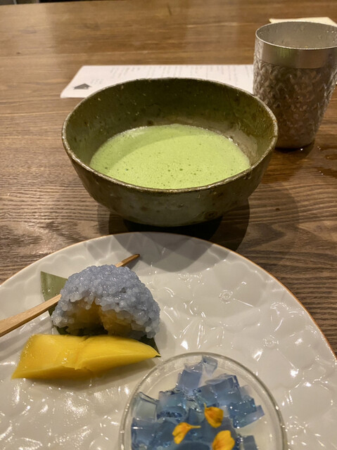 タイの旬のフルーツと合わせて、和と洋のデザートで〆。お抹茶と一緒に。