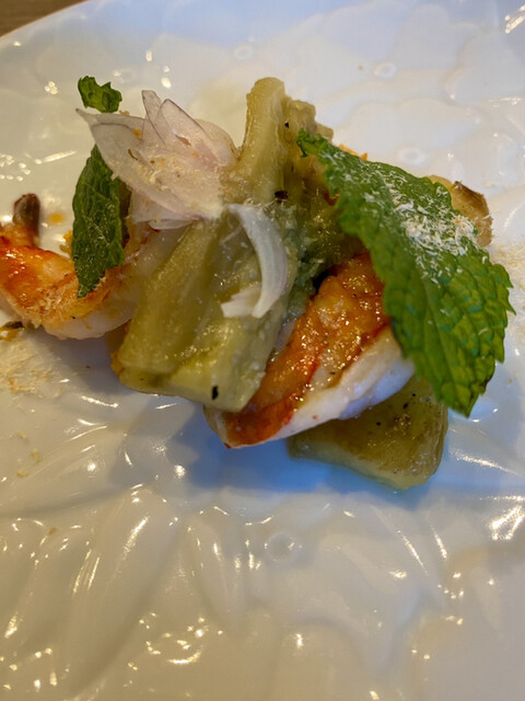 炭で仕上げたエビと青唐辛子、卵、ハーブ、焼きなすが奇跡のバランスでタイサラダに仕上がってます。食感も楽しめるサラダ。